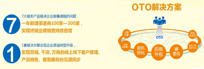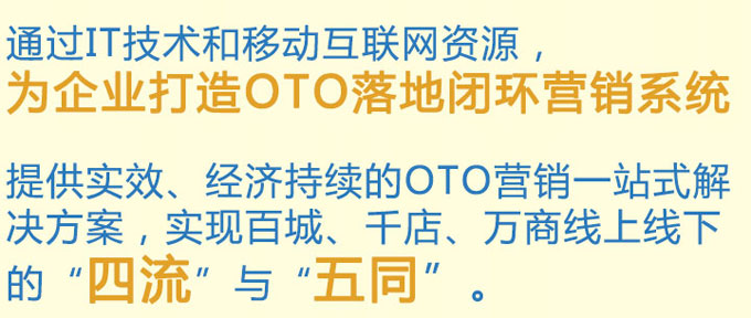 通过IT技术和移动互联网资源,为企业打造OTO落地闭环营销系统,提供实效、经济、持续的OTO营销一站式解决方案,实现百城、千店、万商线上线下的"四流"(信息流、现金流、物流、人流)与"五同"(同品、同价、同促、同会、同台)。